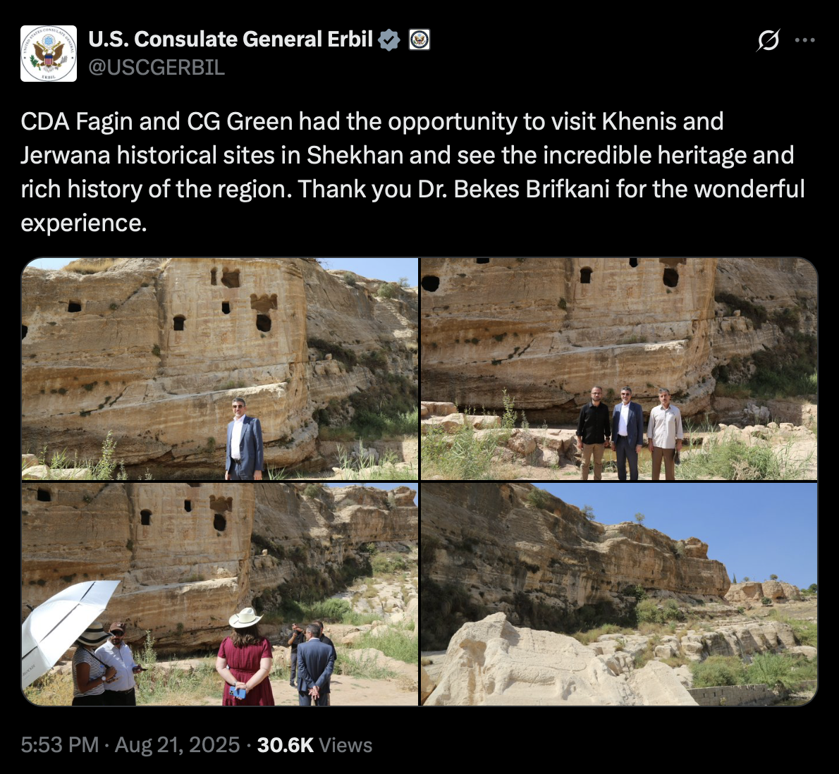 Ambassador Steven Fagin, Chargé d’Affaires at the U.S. Embassy in Baghdad, recently visited Assyrian historical sites in northern Iraq. The official account of the U.S. Consulate General in Erbil on X (formerly Twitter) shared photos of the visit but did not mention that the sites are Assyrian.