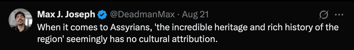 Assyrian human rights researcher Max J. Joseph further observed: "When it comes to Assyrians, 'the incredible heritage and rich history of the region' seemingly has no cultural attribution."