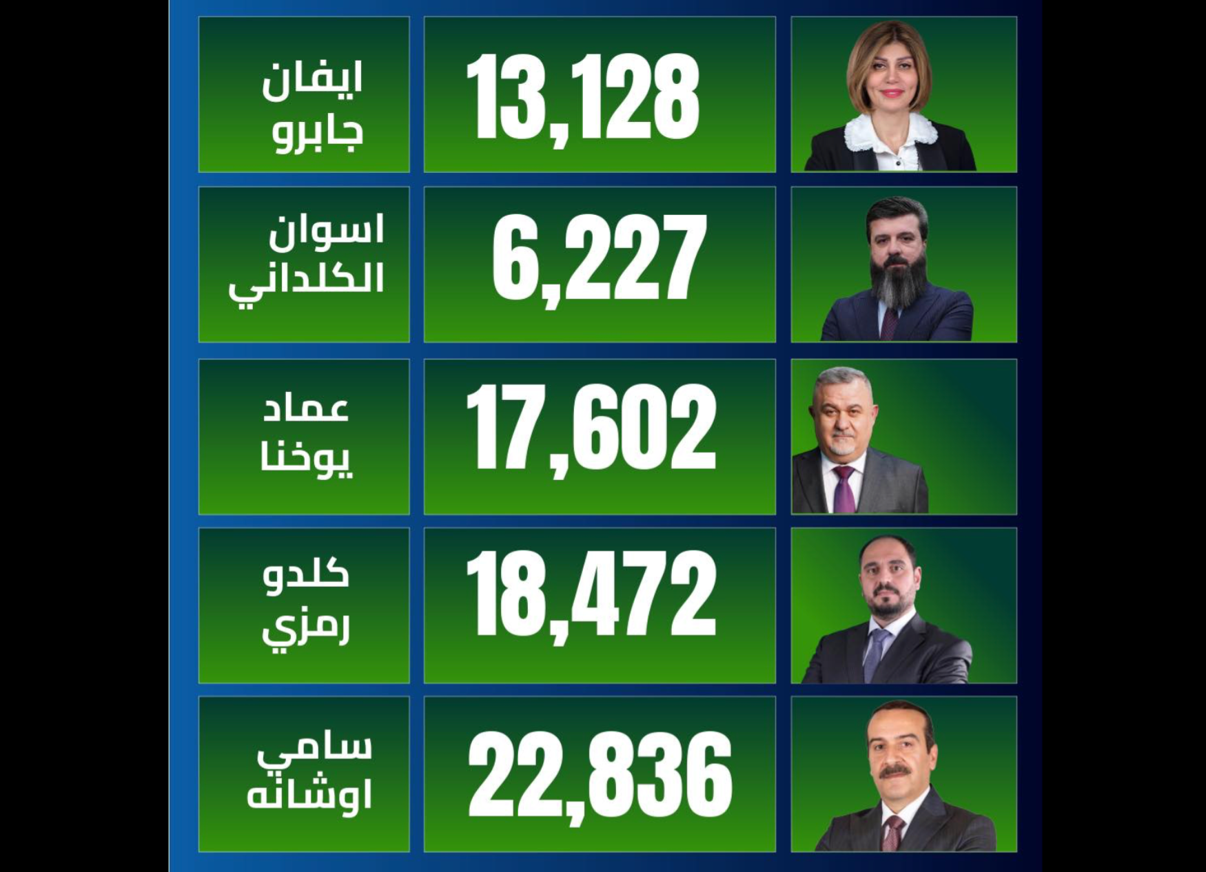 The results show that all five Assyrian quota seats – officially designated as Christian quota seats – have been won by candidates backed by non-Assyrian political parties. The number of votes received by each winning candidate far exceeds the potential turnout of Assyrian voters, raising serious concerns about electoral manipulation and proxy voting.