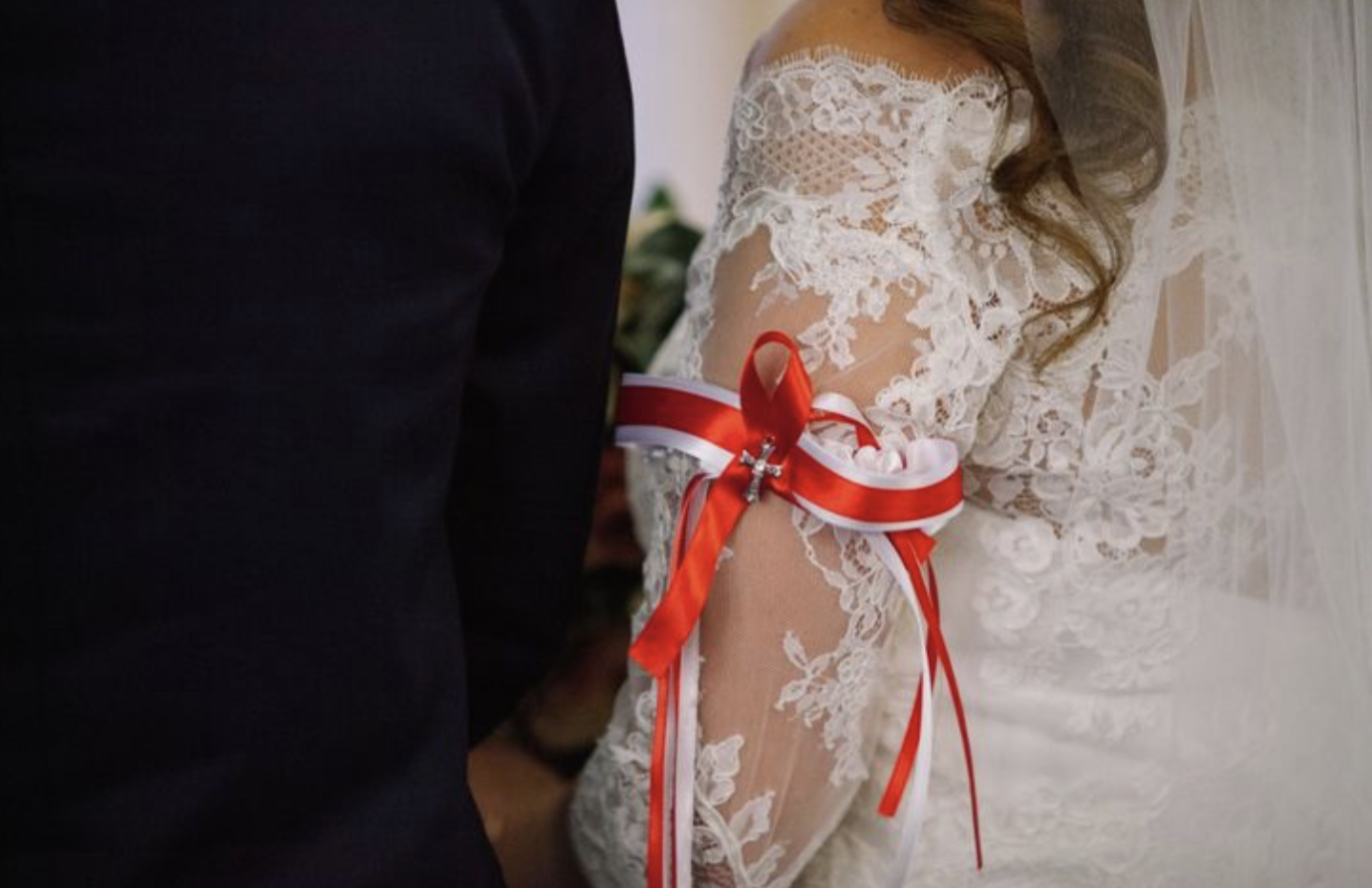 In the past, Assyrian couples would wear braided crowns, though nowadays, they have been made into armlets for aesthetics. The groom and the bride will typically wear silken armlets in the colors red and white, symbolizing the body and soul coming together in the new marriage. Traditionally, crowns would also have the color black to represent death, which can be interpreted as the expression “Til death do us part.” Amongst Assyrians of the Chaldean Catholic church from Iraq, the armband may be replaced with a white bow to signify the wedding as a blessed sacrament. However, this custom isn’t present among Assyrians from the Syriac Orthodox Church. Usually, the armlets are given to a newly baptized child by the priest who performs the baptism and are then kept by the family until his/her marriage, and their name in Assyrian Aramaic is "kleele".