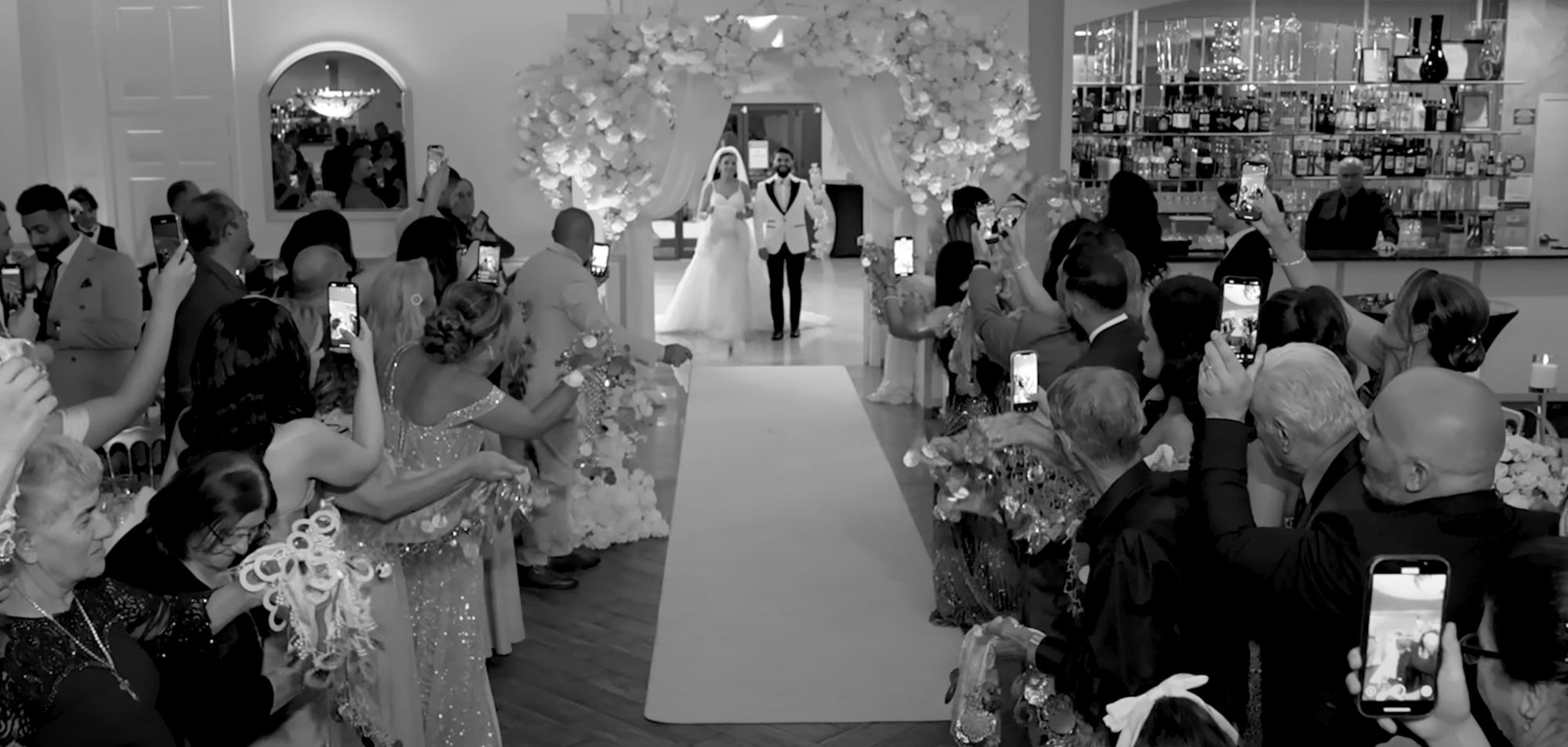 At the beginning of a wedding party, the bride and groom are introduced during what is called a zaffa (ܙܲܦ݂ܵܐ). During the zaffa, everyone in the bridal party dances around the bride and groom as they’re escorted into the reception hall or ceremony. The bride and groom also perform a dance of their own, accompanied by music.